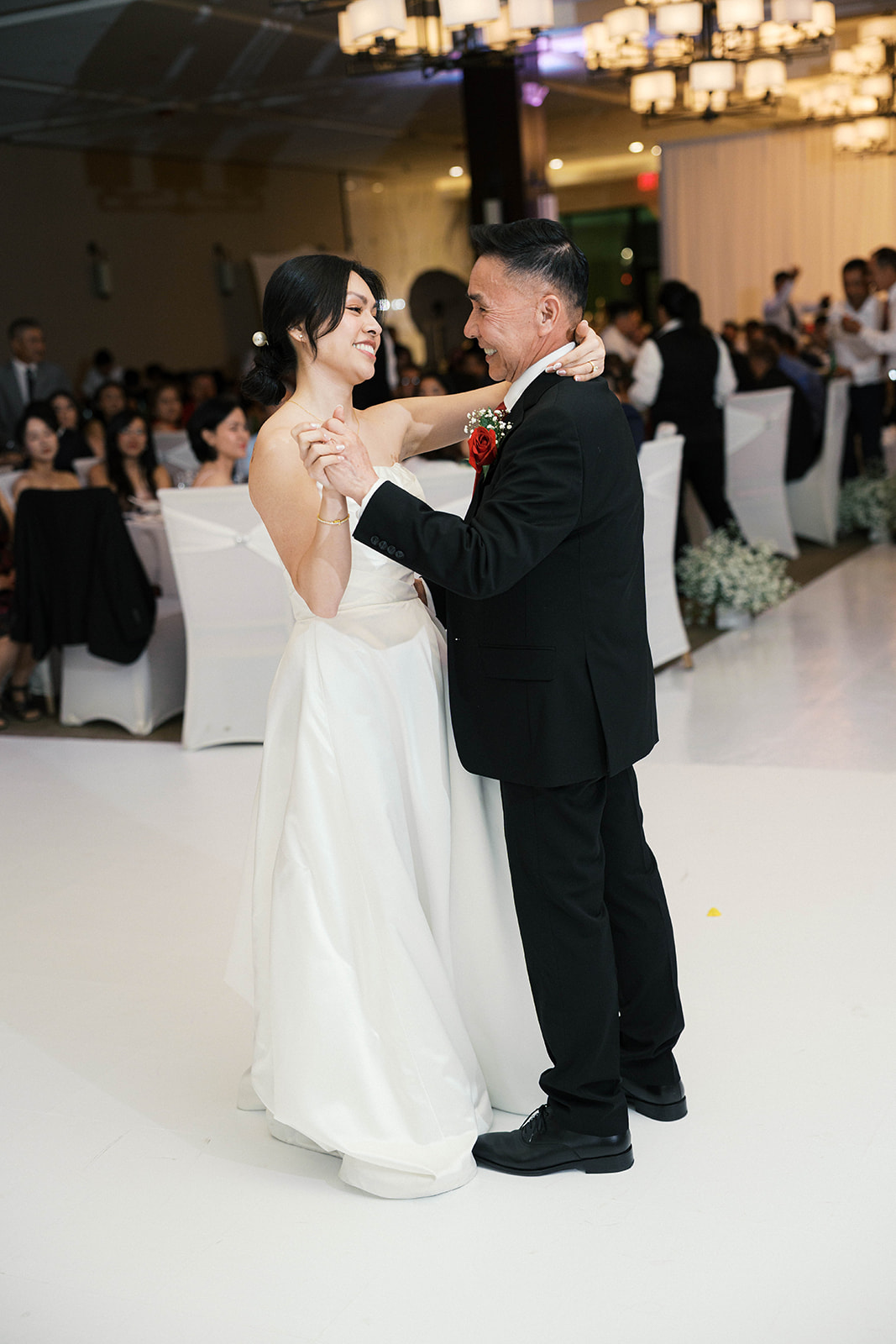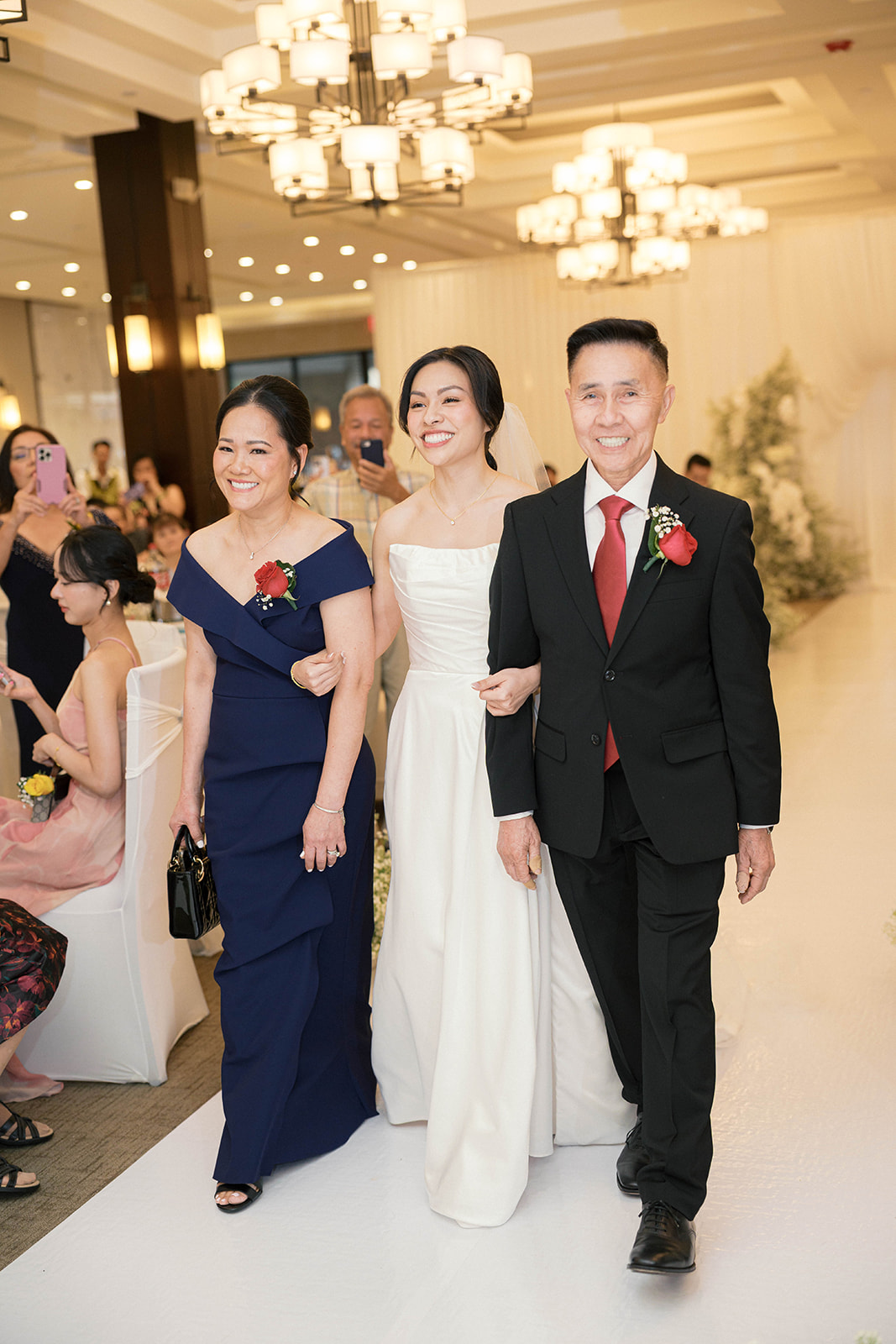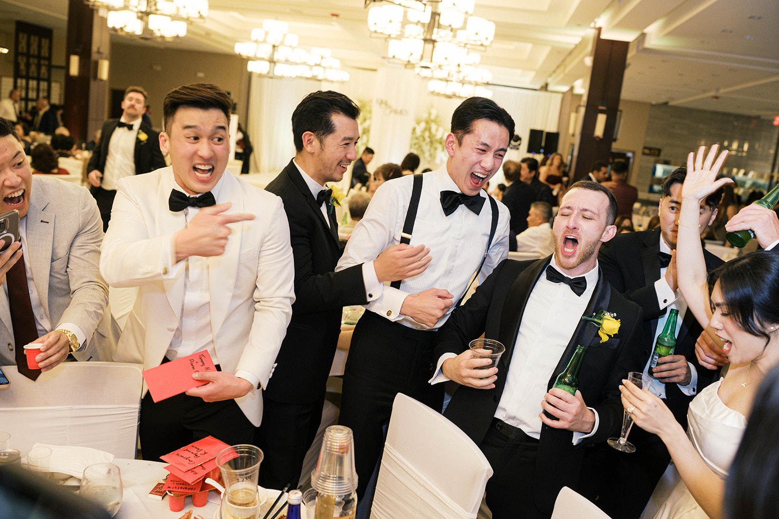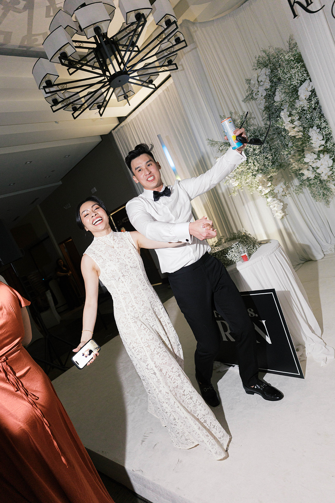 When we arrived at Ming’s Seafood in Quincy, the energy shifted from serene to celebratory. Guests filled the room with laughter and cheers as delicious courses rolled out one after another. If you’ve been to an asian wedding, you know that it’s all about the food and drinks! Ming’s provided a delicious 10+ course meal, and Kim and James roamed around to each table for chào bàn. This is when the bride, groom, and often their parents, walk to each table to thank guests, toast with cognac or beer, take photos, and receive gifts or red envelopes.